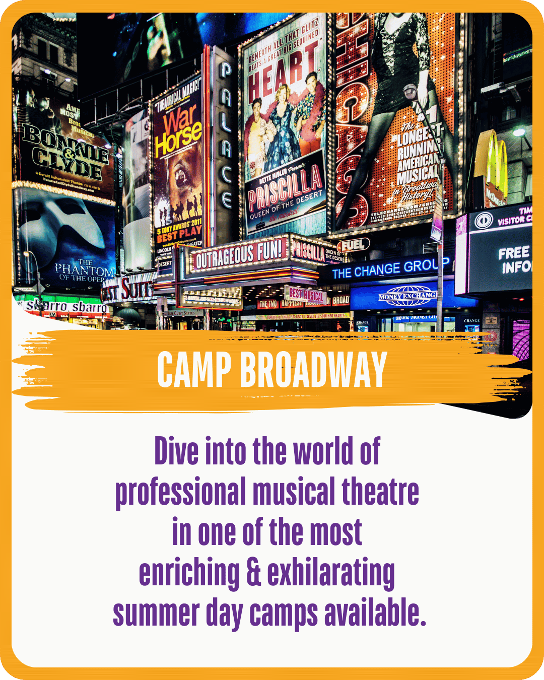 During the summer months, we offer the Broadway Experience Day Camp, an exhilarating summer camp for ages 8-13, teaching skills, meeting professionals from around the country, and touring our professional season daily.